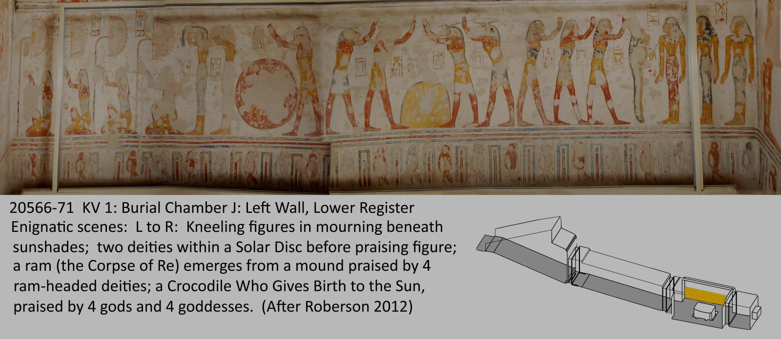The front (southeast) wall shows Sekhmet-Bastet-Weret-Hekau on the left (northeast) side of the gate and Weret-Hekau on the right (southwest) side. The upper registers of the two side walls contain several enigmatic scenes. Both middle registers display scenes from the Book of the Earth, including four women kneeling before fans on the left (southwest) wall. The king faces gate K on either side of the rear (northwest) wall. A dado of kneeling bound enemies alternating with serekh-gates occurs on every wall.