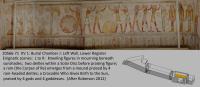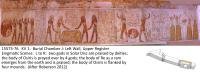 See entire tombThe decoration on the walls is painted sunk relief, and the ceiling is painted plaster. On the left (southwest) wall are three scenes. In the first, the king offers incense and libations to a seated figure of Ra-Horakhty-Atum-Khepri before offering stands bearing a sacrificial oryx, bouquets and food. The second scene is the initial scene and first division of the Book of Gates. The third is the Iwnmutef priest purifying the king as Osiris, derived from the Opening of the Mouth Ritual.