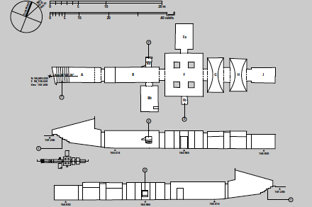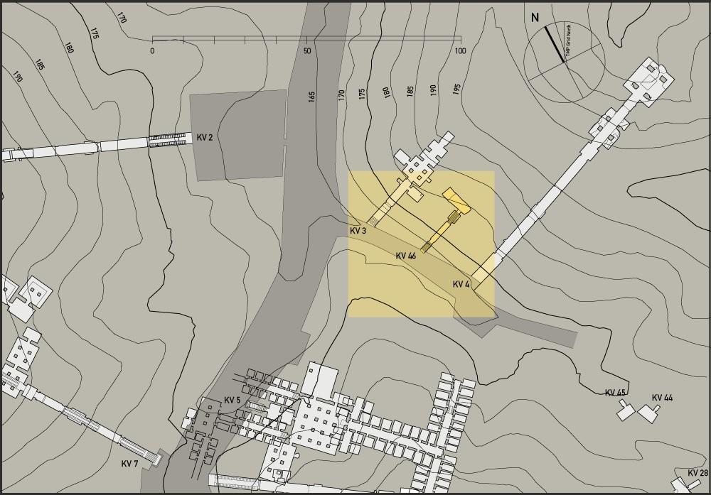 KV 3, located in the first southeast branch off the main Wadi, resembles in plan tombs of royal family members of Dynasty 20 in the Valley of the Queens. Its open entryway (A) leads to a corridor (B) from which side chambers were to open off each side (Ba, Bb). Only the right (south) side chamber Bb was fully cut; a cutting on the left (north) marks the beginning of the gate and side chamber Ba. A pillared chamber (F) follows on the main axis, also with side chambers (Fa, Fb). Here, the left (north) side chamber Fa was completed, while on the right (south) Fb is represented only by the abandoned gate cutting. On the same main axis, three smaller chambers (G, H, J) occupy the rear; the first two have vaulted ceilings.