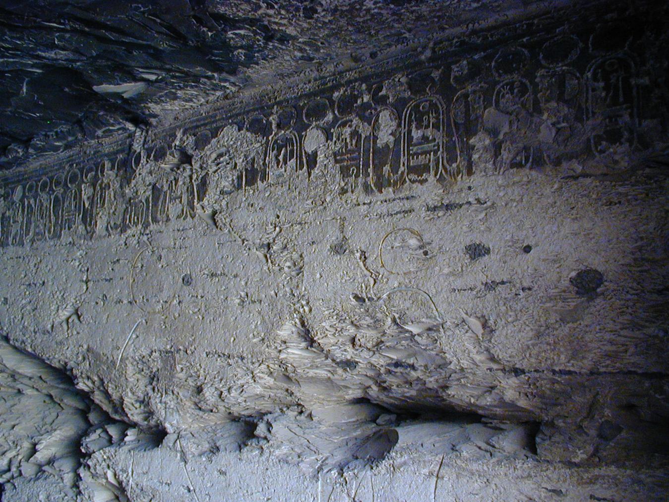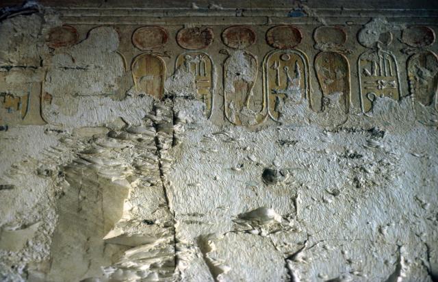 See entire tombImages of Rameses III preceding figures of the prince can be seen on the walls where they were cut through the plaster coating into the rock beneath. The preserved traces show a sequence of at least three scenes on each side, consisting of the prince behind the king facing a deity. On the left (north) wall, the deities are Ptah, a damaged figure, and Osiris. On the right (south) wall they are Ra-Horakhty, Thoth, and a damaged figure. At the top of each side of the corridor a frieze of cartouches of Rameses III is flanked by pendant uraei. There is a rectangular cutting, the start of a chamber (Ba) in the left (north) wall, and the gate to a cut side chamber (Bb) in the opposite wall.