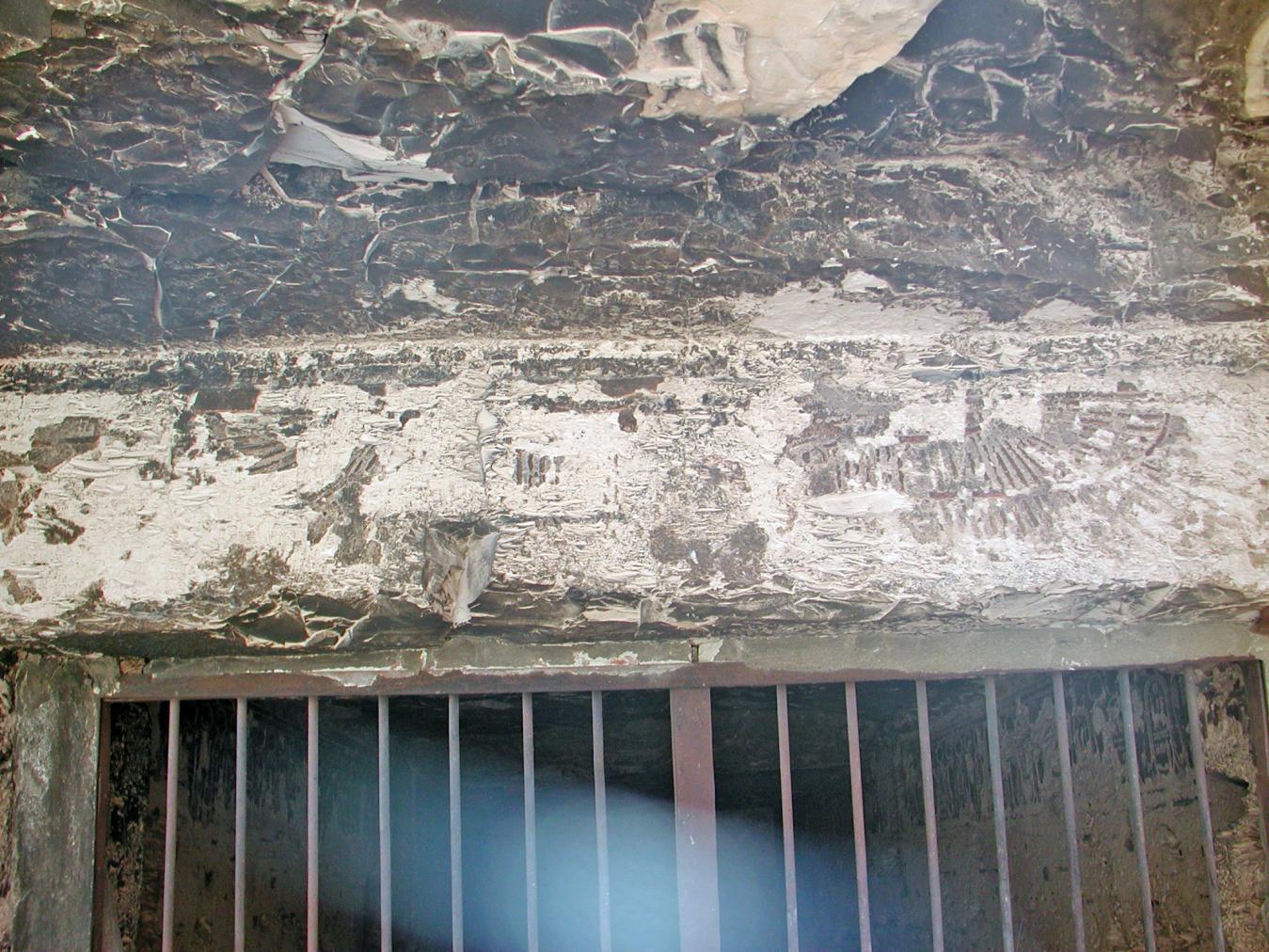 The painted plaster wall decoration has almost entirely fallen away except near the ceiling in corridor B. A coating of smoke from recent burning of trash in the corridor entrance has damaged the ceiling.