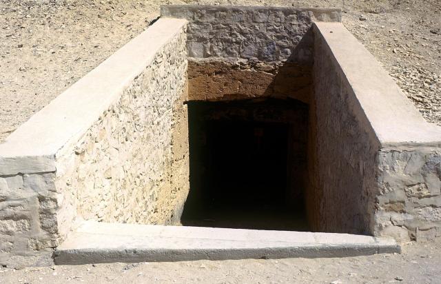 See entire tombSeven modern steps descend from the present valley floor to the entryway, which gently slopes toward gate B. A modern retaining wall has been erected around the sides and ends of the entryway.