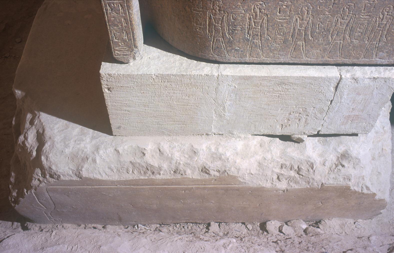 During the later stages of the tomb's construction, door jambs from entryway A to chamber H were cut away, probably to make room for the descent of the massive granite Sarcophagus. The jambs were then replaced with inscribed sandstone blocks keyed into place with dovetail cramps. The cramps fit into slots atop the blocks, which were installed in the bottoms of recesses where the original jambs had stood. None of these blocks were apparently found in their original locations, but some were found in the fill of the Well shaft, and on the floor of burial chamber J. Perhaps at this time the rear two pillars in pillared chamber F were also removed.