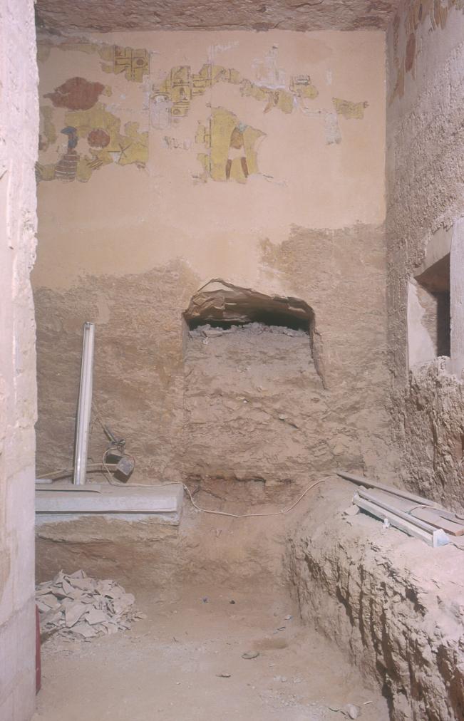 Recent conservation efforts by the Supreme Council of Antiquities have covered over the breaks in the corridor walls and ceilings, and covered over the scars from the cutting back of the original door jambs. The position of the replacement jambs was reconstructed in cement.