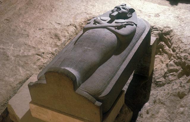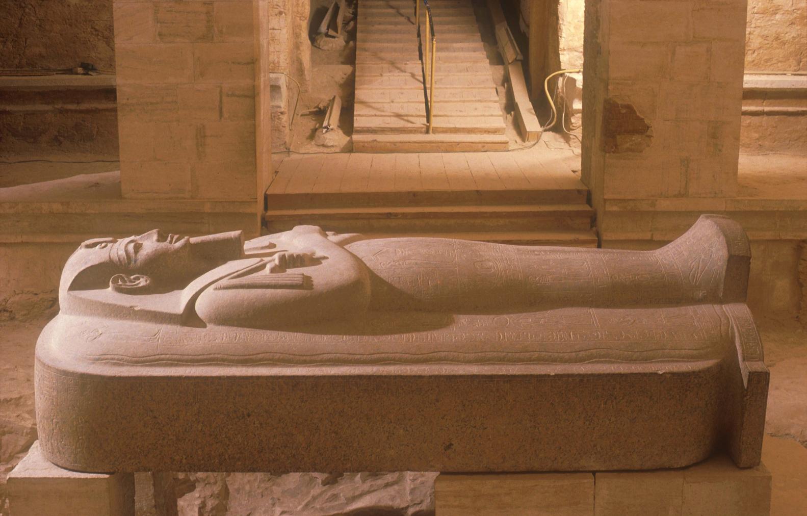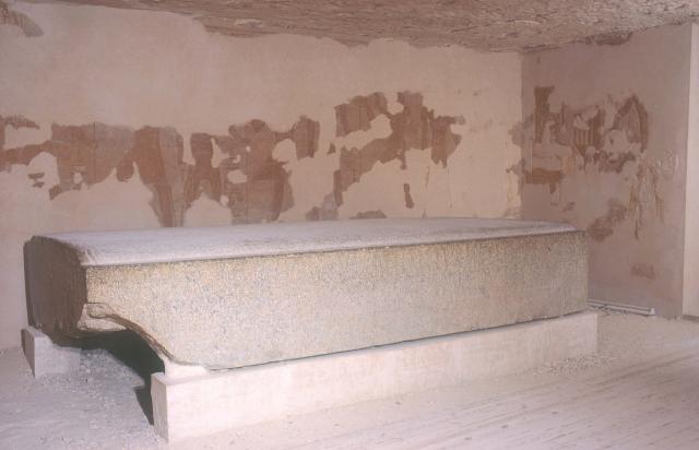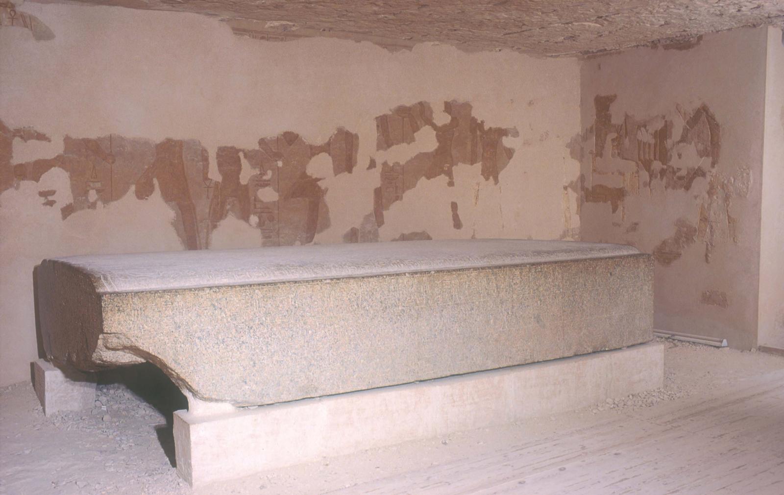 Parts of the tomb lay open at various later periods. Following the removal of the plundered mummy for reburial in KV 35, an effort was made to re-use pieces of the sarcophagus. The first and second sarcophagus boxes were broken up and the the third granite sarcophagus was moved to Tanis. In the process, the well shaft was filled in, and this allowed later floods to carry debris into the bottom chambers of the tomb. We know that upper chambers of the tomb (up to pillared chamber F) were accessible during Greek and Roman times because of the 135 graffiti written on the walls.