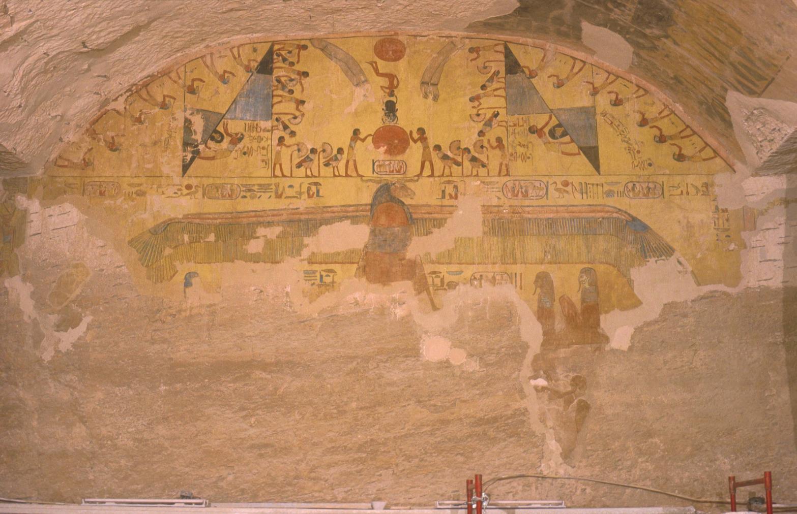 There is a severe loss of decoration, but the eighth division (P)/ninth hour (H) of the Book of Gates is visible on the left wall. Other scenes represented are the Book of the Earth and the Book of Caverns. The vaulted ceiling has astronomical scenes including representations of deities in barks.