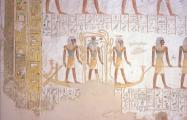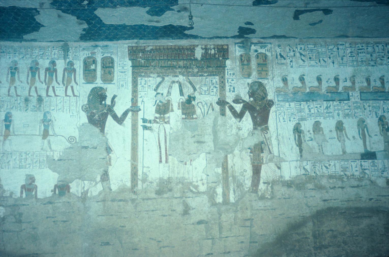 See entire tombThe floor of this roughly square chamber is occupied by a well shaft. The west wall of the shaft follows a sloping vein of calcite. The left (south) half of the chamber has depictions of Osiris-Wennefer, two Sons of Horus and four deities who face the tomb entrance. Anubis and two Sons of Horus face the tomb interior. The right (north) side of the chamber repeats this scene, but the king as Iwnmutef replaces Anubis.