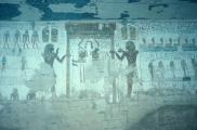 See entire tombThe corridor has suffered a severe loss of decoration, but enough traces survive, cut through the fallen plaster into the rock surface beneath, to indicate the general decorative program. This consisted of the Opening of the Mouth ritual. It begins on the left (south) wall with a large scale image of the king seated at an offering table before which two priests officiate. The corridor slopes down to chamber H, but levels off before the gate to form a landing.