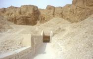 See entire tombThe original jambs were cut away to allow passage of the sarcophagi. A pair of rectangular notches, cut into the area of the thicknesses, indicate how the replacement blocks for the jambs were held in place. Cramps were inserted in slots in the bottoms of the notches and the tops of the blocks. Beam holes were cut just in front of the gate. Cartouches decorate the outer lintel.