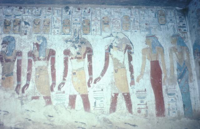See entire tombThis small chamber is actually a small shrine to Osiris. It may be an abandoned start for another chamber, or a purpose-cut shrine. The interior surfaces have been plastered and decorated with paint. On either side of the gate, the short interior walls are decorated with cartouches of Rameses II referred to here as the "Osiris-king." Figures of the four Sons of Horus are painted on the left (south) and right (north) walls with Isis and Nephthys, while Osiris is shown on the rear (west) wall accompanied by two goddesses, Qebhyt and Nedjti.