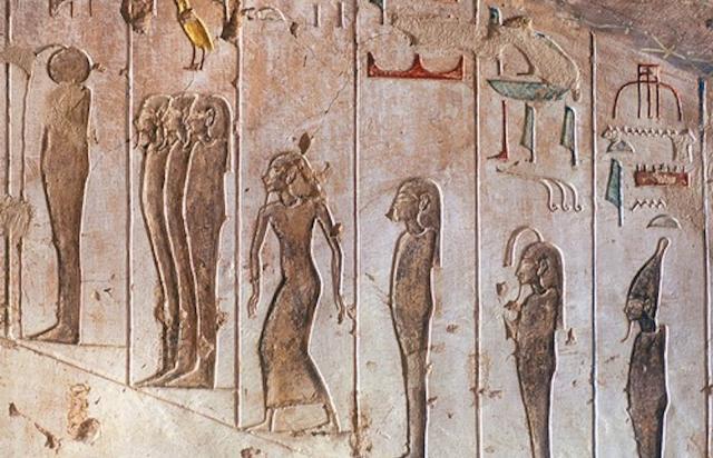 The third, fourth and fifth divisions (P)/fourth, fifth and sixth hours (H) of the Book of Gates form the decorative program of the chamber, together with a double scene of the king offering to Osiris in a shrine, carved on the center of the rear (west) wall above the descent. The two pillars are decorated with scenes of the king making offerings to Osiris, Ptah and Ma'at, standing before Ra-Horakhty and receiving life from Anubis.
