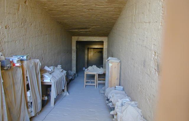 See entire tombNo decoration is preserved in this corridor. The ceiling is barrel-vaulted and many pieces have fallen from here after past floods. The concentration of broken burial equipment, such as pieces of a red granite sarcophagus lid of Takhat and fragments of canopic jars bearing her name suggest that this corridor may have served as a burial chamber.