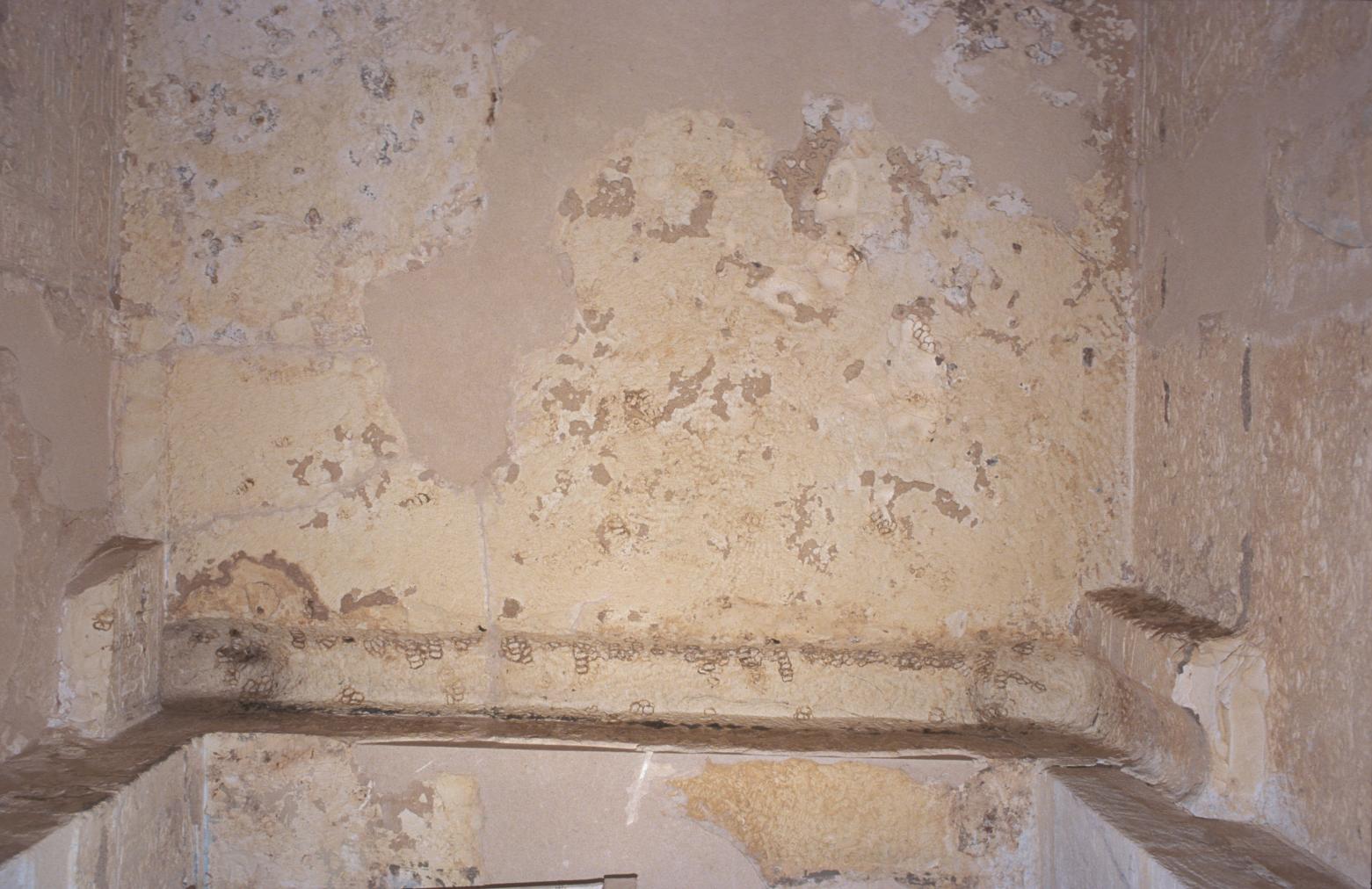The painted plaster relief in the upper corridors has suffered some damage, partly as a result of ancient alterations of decoration, and the action of salt efflorescence. In general, however, the rock is stable, the painted paste decoration is largely intact, and the colors are bright. Water staining is visible around cracks in the plaster of the vaulted ceilings in the two burial chambers J1 and J2.