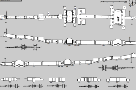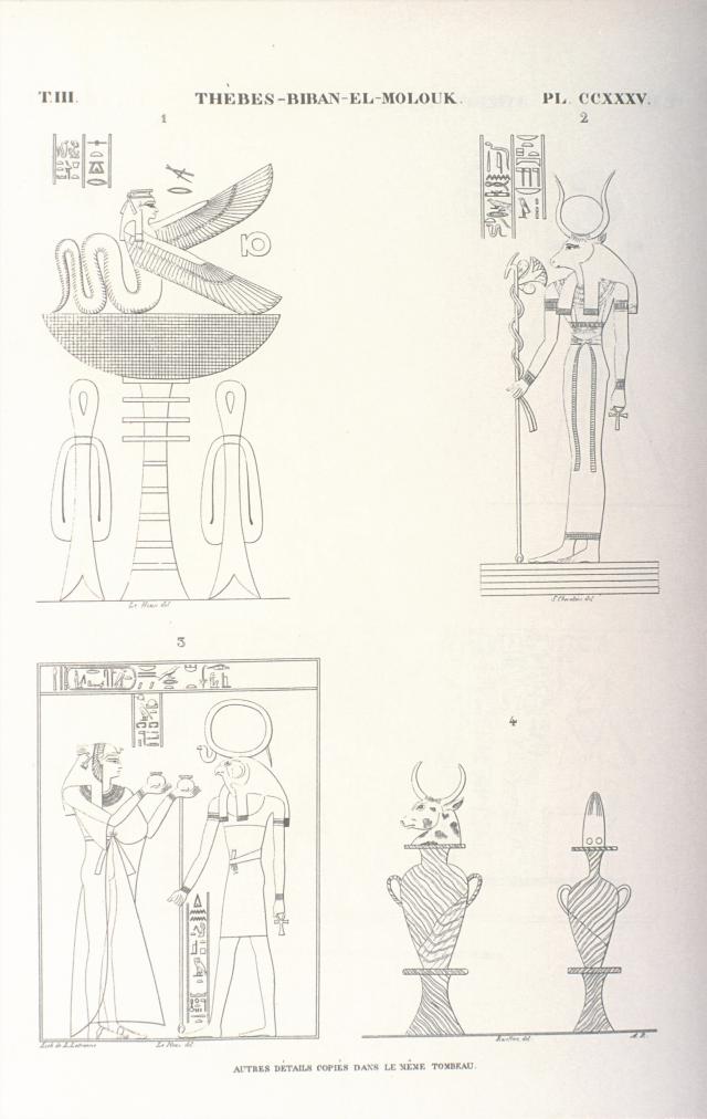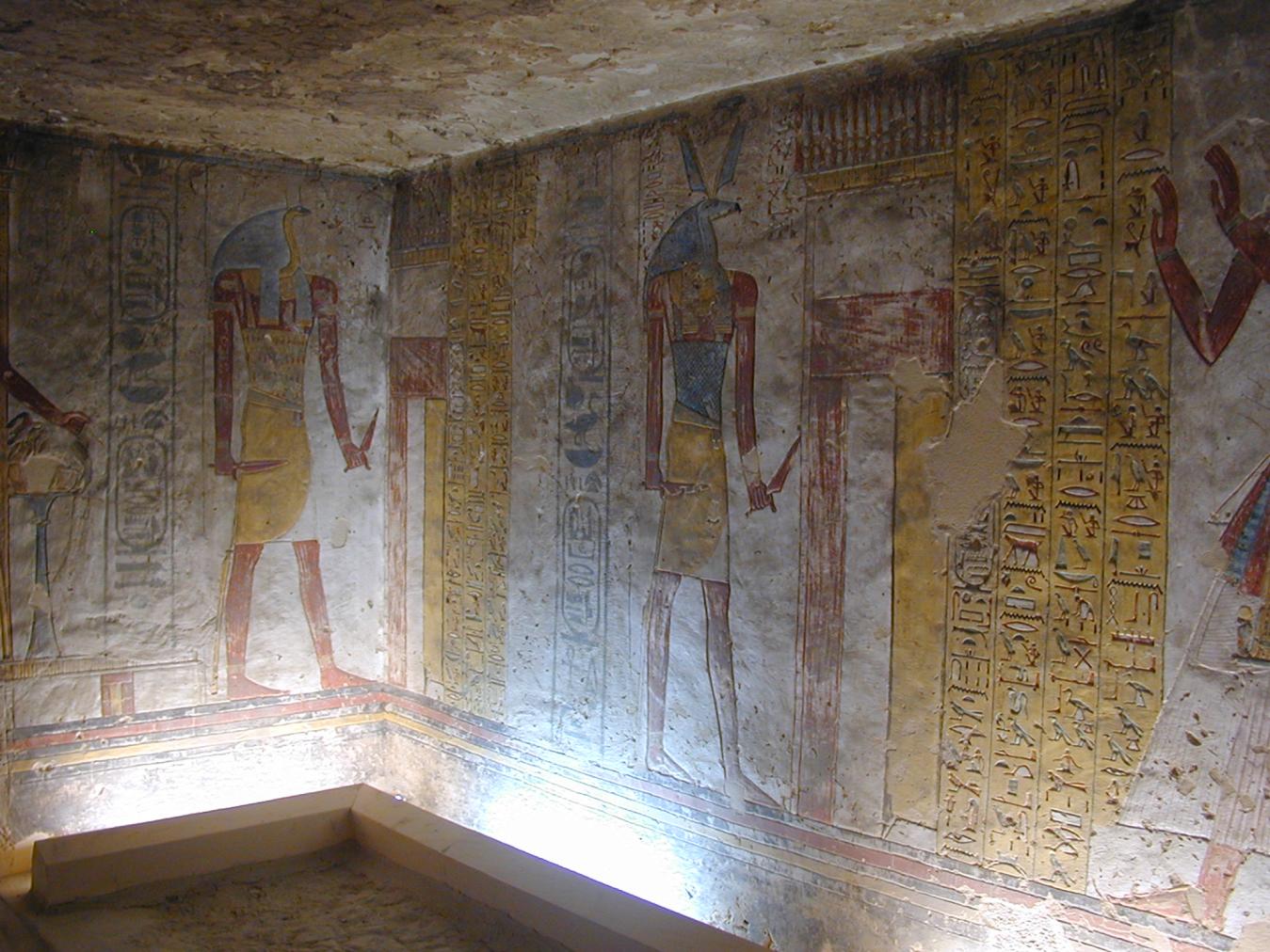 The four side chambers were completely cut, but undecorated, and only the front (east) wall of this burial chamber received preliminary drawings for decoration. A broken Sarcophagus and lid are located right (north) of the center of the sunken floor. An unfinished axial corridor (K2) to the rear (west) has an abandoned gateway cutting in each side. The tomb is decorated with scenes from the Book of the Dead (corridor C, corridor D, pillared chamber F, descent F, side chamber Ga), Opening of the Mouth ritual (corridors G and H), Book of Caverns (burial chamber J1), Book of the Earth (burial chamber J1), Book of Gates (burial chambers J1 and J2), the Imydwat (corridor K1, corridor L), as well as images of the deceased and/or deities (corridor B, gates C-E, chambers E and F, side chamber Ga, gate H, gate I, chamber I and burial chamber J1).