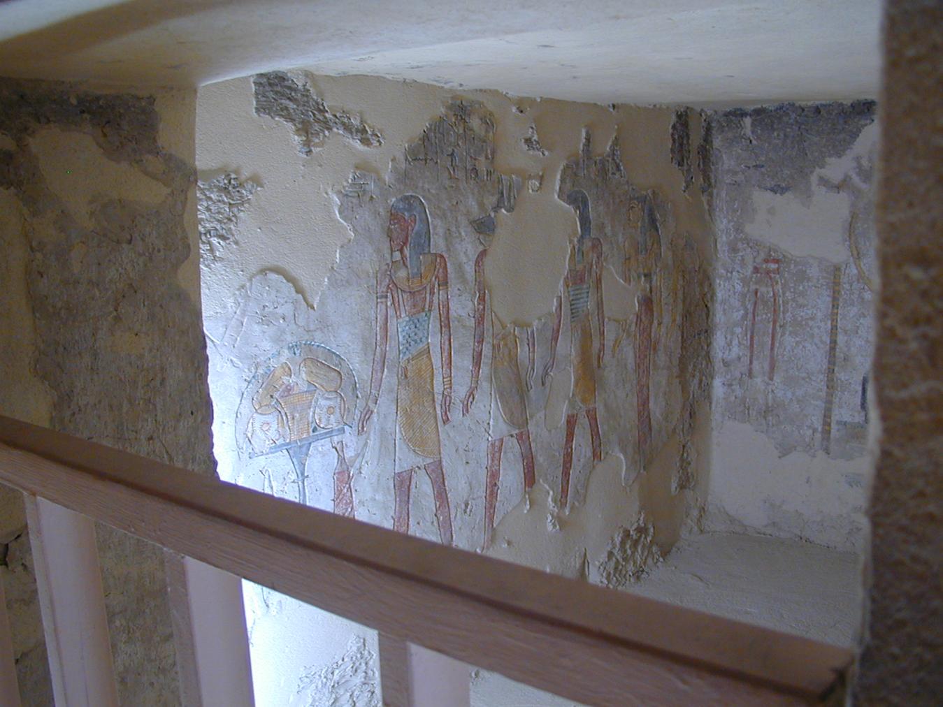 See entire tombSalt efflorescence has damaged the painted decoration on the walls. On the left (south) and right (north) walls are spells 145 and 146 of the Book of the Dead with four guardians holding knives.