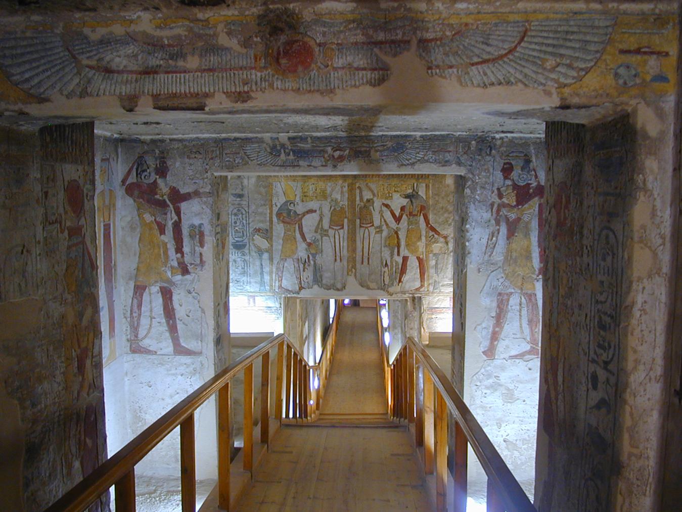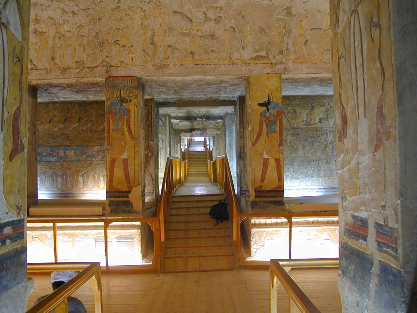 See entire tombThe slope of the descent begins at the inner edge of gate F and ends in gate G. There are no steps cut in the ramp; its surface is irregular. There are remains of scenes from Book of the Dead spell 151 at the lower ends of the side walls of the descent showing an Anubis jackal above kneeling figures of Isis and Nephthys on the left (south) and right (north), respectively.