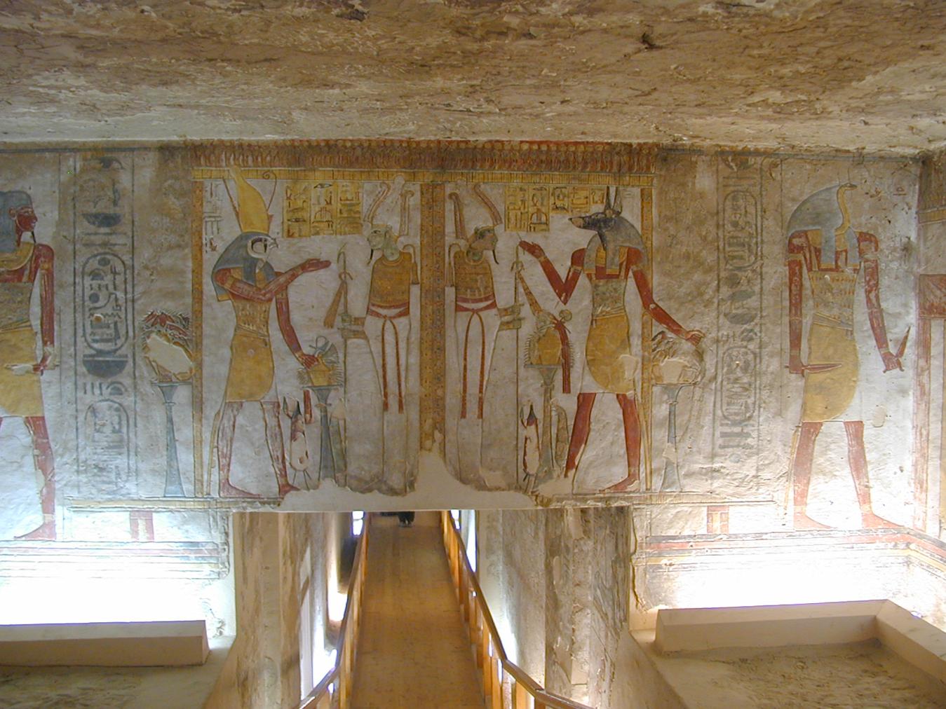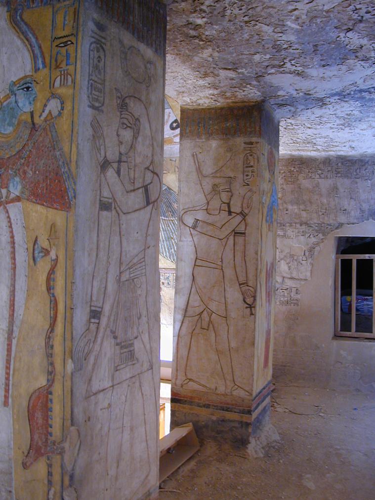 The vault bears traces of an astronomical scene with decans, northern constellations, and associated deities. The pillars were partially decorated with representations of different deities and of the king, whose figure has been replaced, or at least re-named, by Setnakht. In the lower registers of the side walls, and on the walls surrounding the sunken central floor, were illustrations of traditional funerary equipment.