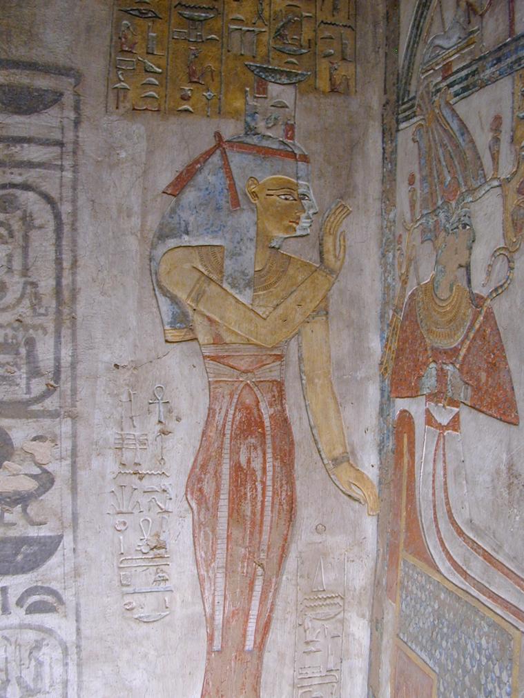 See entire tombCorridor K1, together with side chambers K1a and K1b, represents an abandoned attempt to cut a second pillared burial chamber. Two gates in the right (north) and left (south) walls, each with a step at the bottom, lead from the beginning of corridor K1 to chambers K1a and K1b, respectively. The north and south walls of the corridor are decorated with unfinished texts and scenes from the Imydwat.