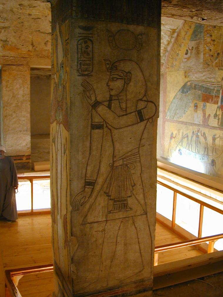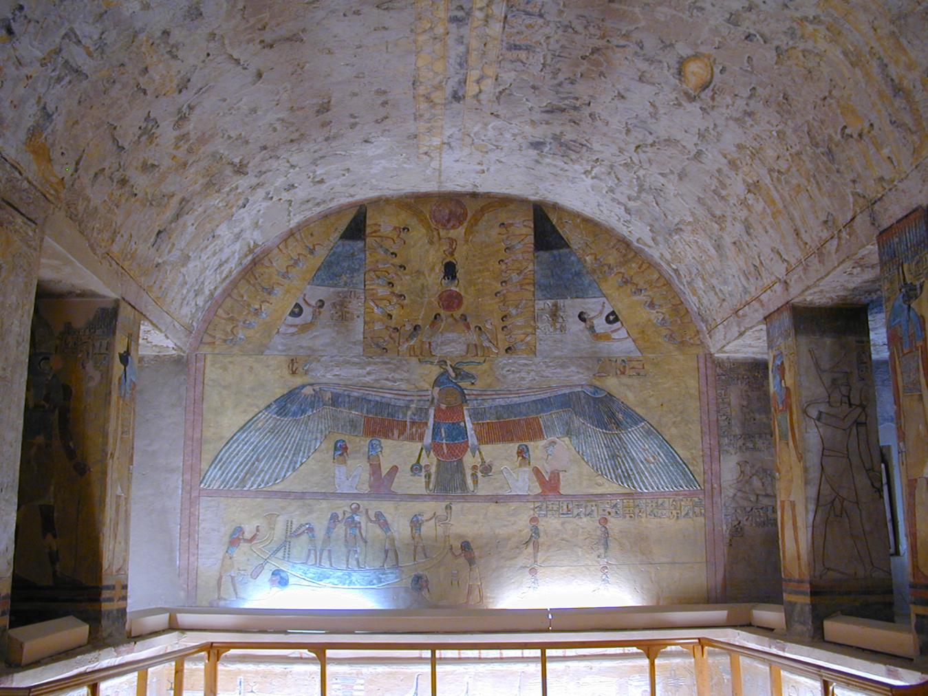 See entire tombOn the inner thicknesses, Meretseger as a winged cobra rests on a basket above a djed pillar and tyet knot. The outer thicknesses have been cut back and Setnakht's cartouches painted on the new surface.