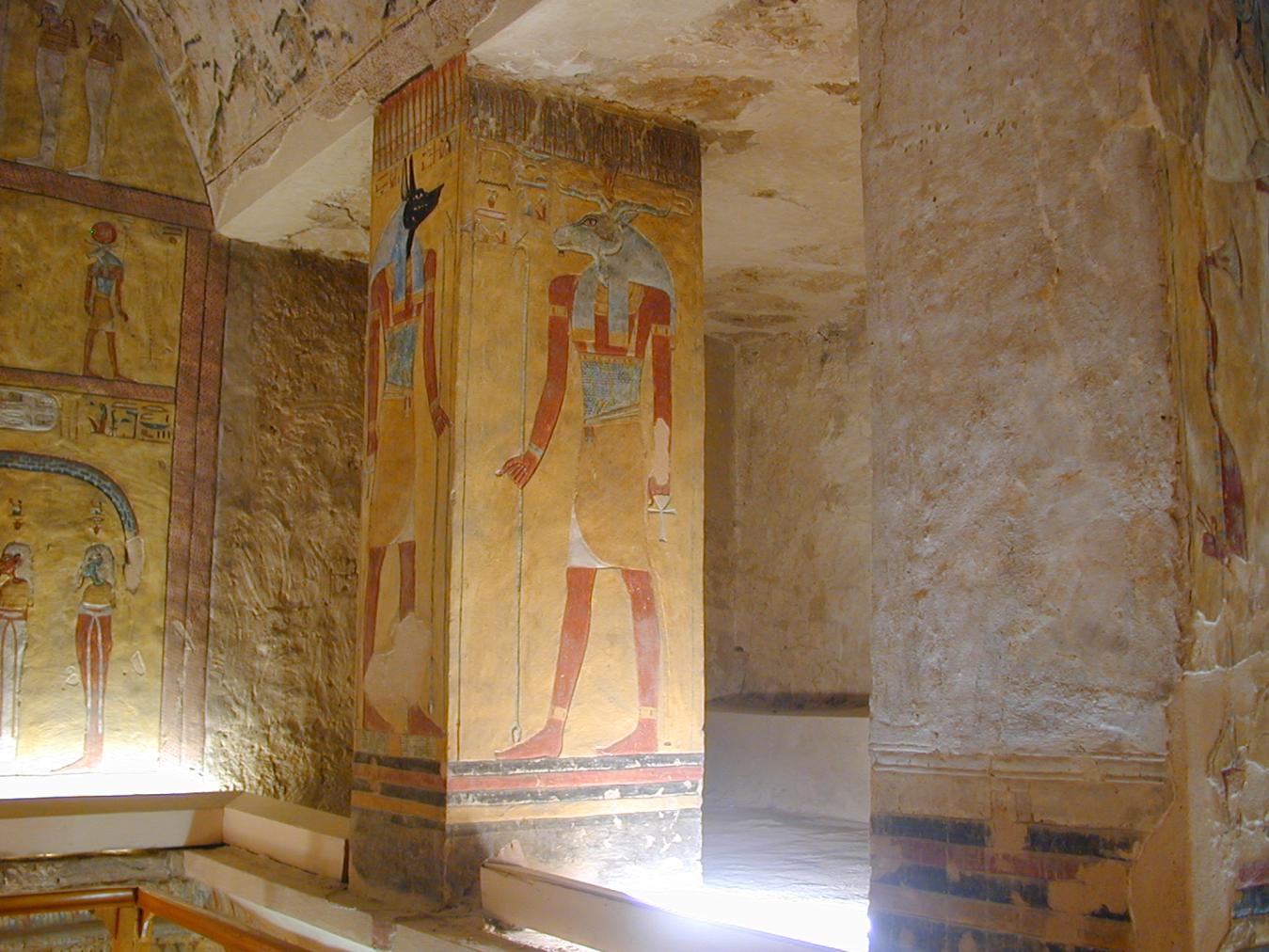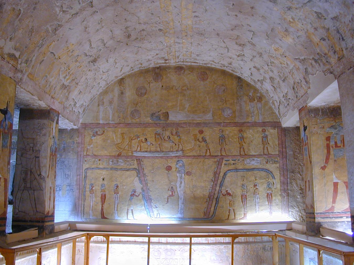 See entire tombThe chamber lacks pillars, but a central descent takes up the axial floor space. Book of the Dead spell 146 decorates the right (north) and left (south) walls. A double scene of the deceased before Osiris on the rear (west) wall originally showed Tausert led before Osiris by Anubis and Horus, but her figures have been erased and replaced by large-scale cartouches of Setnakht. This was also done on the right and left walls.