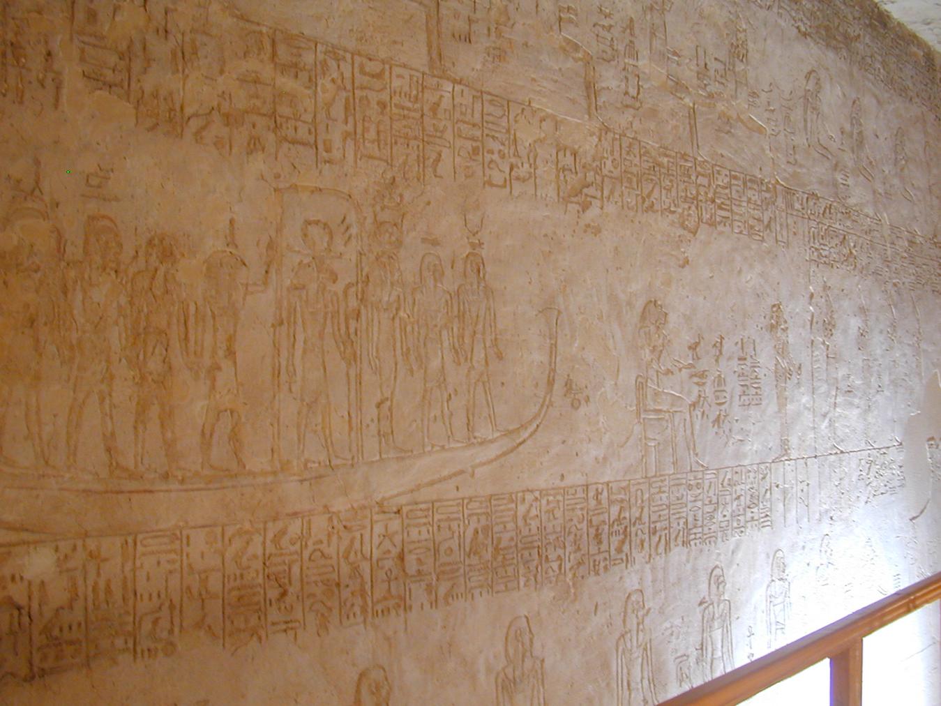 See entire tombThe axis of this corridor is shifted to the north of previous ones. Beam holes are set in the middle of the walls of the corridor. The right (north) and left (south) walls are decorated in unpainted sunk relief with scenes from the Imydwat.