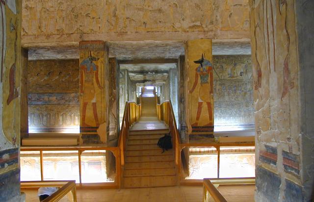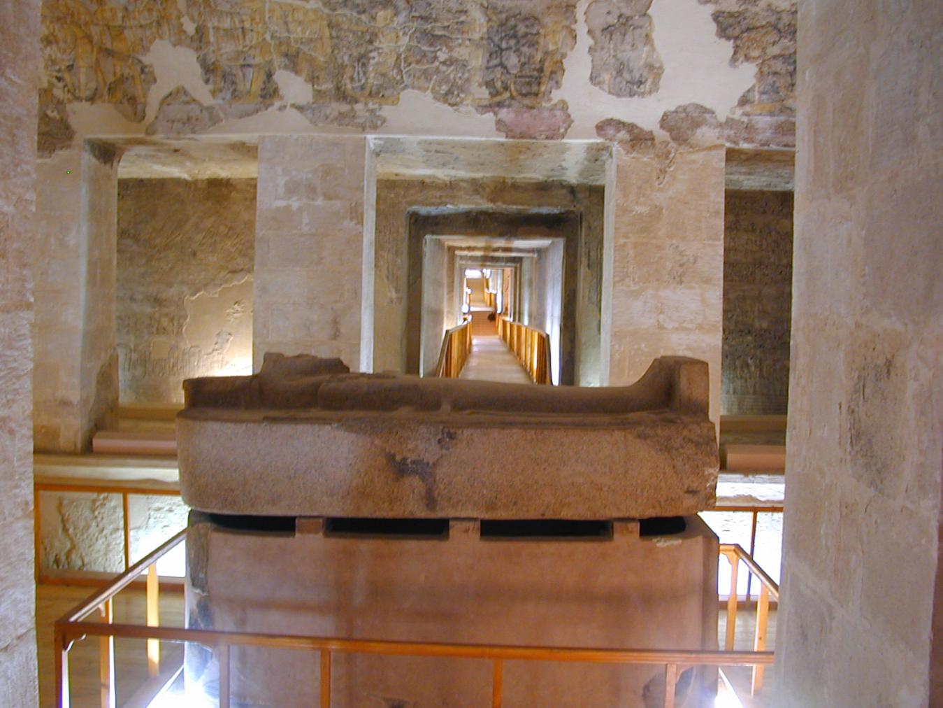 See entire tombThis chamber replicates the features of burial chamber J1, but on a larger scale. The upper floor level is interrupted by a sunken central area, flanked on the front (east) and rear (west) by a row of four pillars. Cavetto cornices decorate the tops of the low walls surronding the sunken central area. The eight pillars are square in section and the ceiling surfaces between them and the chamber walls are flat. The ceiling above the sunken lower floor is vaulted, with its longitudinal axis perpendicular to that of the tomb. Right (north) of the center of the floor stands the broken sarcophagus of Setnakht. The upper floor level is bisected at front and back by a ramp descending to the sunken lower floor level from the edges of gates J2 and K2.