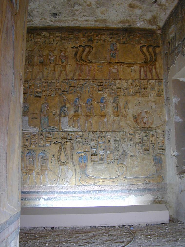 The right end of the right wall and the left half of the front wall of the upper level are decorated with the eighth division (P)/ninth hour (H) of the Book of Gates. The right half of the front wall and left end of the left wall of this same level are decorated with the upper and lower registers of the ninth division (P)/tenth hour (H) and the middle register of the tenth division (P)/eleventh hour (H) of the Book of Gates. The Book of the Earth is shown on the upper level right and left walls, and the Book of Caverns on the right. The rear wall of the upper level was left undecorated.