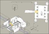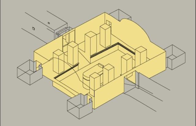 See entire tombThis large rectangular chamber has a vaulted central ceiling above a sunken lower floor, flanked by a row of four pillars at the front and rear (east and west). The long axis of the vault is perpendicular to the axes of the preceding corridors. A ramp descends from gate J to the sunken floor, bisecting the front upper floor level, topped by a row of four square pillars. The row of pillars on the rear upper floor level are rectangular in section, their right (north) and left (south) faces wider than their front and rear faces. The rear half of the upper floor level is bisected by a passage at the level of the sunken floor leading to gate K1. Narrow benches project from the right and left halves of the rear wall above the upper floor level. The tops of the low walls surrounding the sunken lower area are all decorated with torus molding and a cavetto cornice.