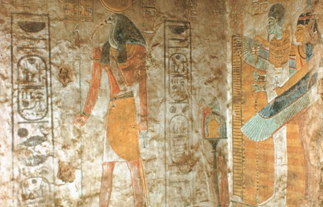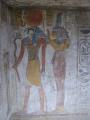See entire tombOn the right (south) half of the front (east) wall, a table of offerings replaced an erased figure of Tausert and representations of Thoth, Ra-Horakhty and Ptah, protected by a winged Ma'at. Osiris, Isis, Nephthys, Horus, Geb and Ptah are protected by Ma'at on the right (north) wall of the chamber. Representations of the king and queen have been replaced by large cartouches of Setnakht.