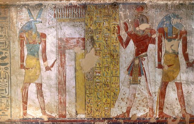 See entire tombSalt efflorescence has damaged the painted decoration here, which includes traces of excerpts from Book of the Dead spells 145 and 146. On the left (south) wall is a scene in which Sety II is purified by Anubis, followed by a partly preserved scene of a gate and guardian. On the right (north) wall, Sety II offers to three guardians. Beam holes are cut in the walls midway through the corridor.