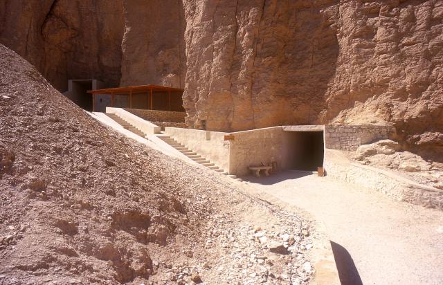 See entire tombThe short overhang of entryway A projects out from above this gate's lintel, which is decorated with a sun disk containing the scarab and ram-headed forms of the sun god Ra, flanked by kneeling figures of Isis and Nephthys, and Tausert's queenly titles. A second, slightly larger version was carved over this by Setnakht. The reveals are decorated with texts. Both the outer and inner thicknesses on the left (south) side of the gate were cut away in antiquity, as was the inner thickness on the right (north) side (except at the top). The outer thicknesses have been replaced or supplemented by modern concrete jambs to support a metal gate. Three modern steps were added to the original step down to the floor of corridor B.