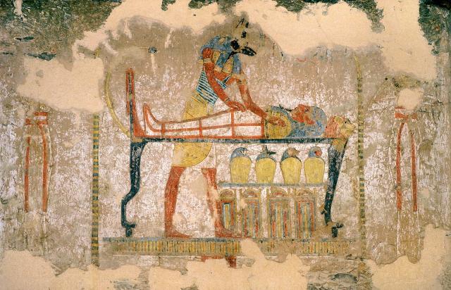 See entire tombDjed pillars were carved on both sides of the entrance gate of this small, rectangular side chamber, which is unique to this tomb. On the left (east) and right (west) walls, the king (originally the queen) offers to two Sons of Horus, Anubis, and two goddesses. On the rear (south) wall, Anubis tends a mummy between Isis and Nephthys.
