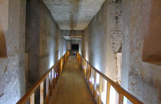 There are two corridors (G and H) beyond the descent, followed by a chamber (I). There is a side chamber (Ga) off the left (south) wall of corridor G, thought by some to have been intended as a burial chamber in an earlier phase of the tomb's construction. The first burial chamber J1 has a Vaulted ceiling and sunken floor flanked by two rows of four pillars on benches to the front (east) and rear (west). Four unfinished side chambers are located at the corners of burial chamber J1. The corridor K1 to the west, with two side chambers (K1a, K1b), represents an abandoned start of the cutting of a second burial chamber. A second corridor (L) leads to the ultimate, second burial chamber J2, of larger dimensions than the first one. This chamber also has a sunken central floor and vaulted ceiling flanked by two rows of four pillars on benches to the front (east) and rear (west).