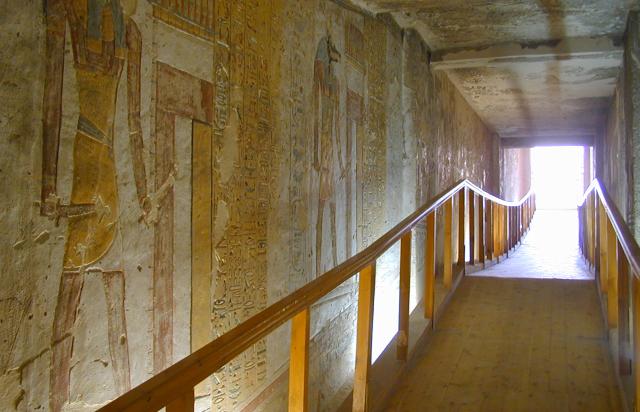 See entire tombThe corridor slopes down gently to corridor C. On the left (south) wall are altered scenes of Tausert offering vases to Ra-Horakhty and food to Anubis, Siptah (changed to Sety II) offering the image of Ma'at to Isis, and Setnakht (superimposed on Tausert) before Horus and receiving an ankh from Nefertem. The right (north) wall shows Tausert before Ptah and Ma'at, Siptah (changed to Sety II) followed by Tausert offering to Geb, and Setnakht (superimposed on Tausert) offering to Ra-Horakhty, Hathor and Nephthys.