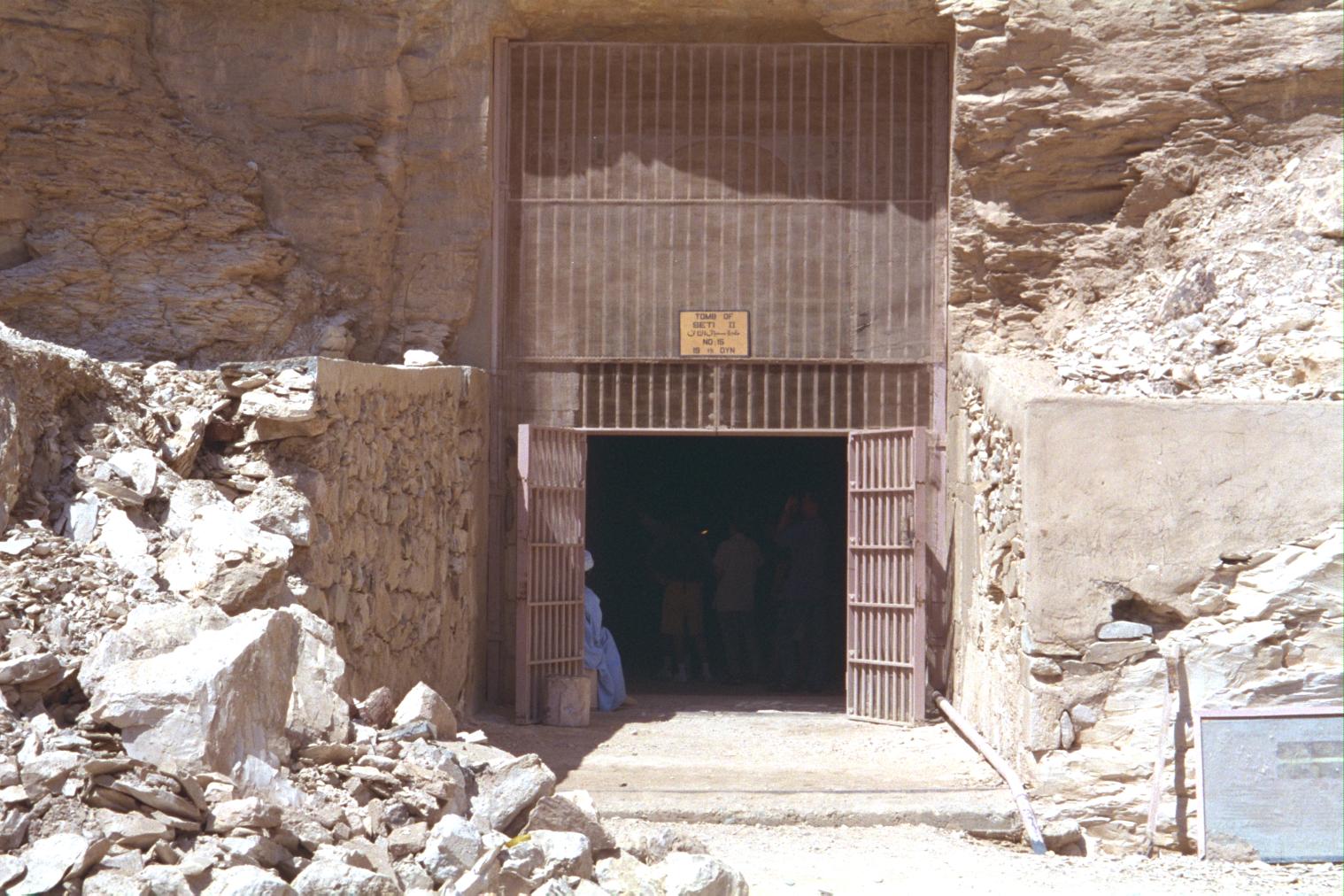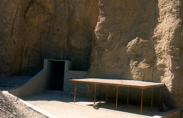 See entire tombThe entryway to KV 15 is cut directly into the mountain face rather than in a stepped manner which is typical of earlier tomb entrances in the Valley. The rubble walls of the entrance are covered with layers of white plaster. After the 1994 floods, a cement extension with roof was built out from the cliff face to protect the entrance.