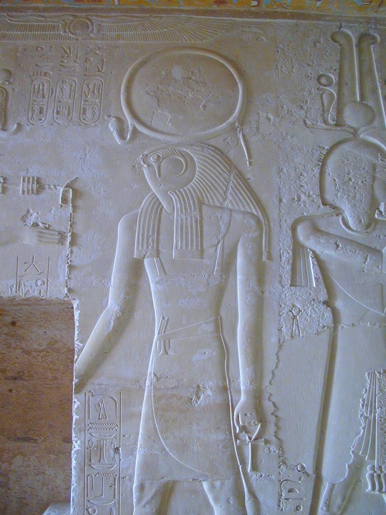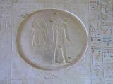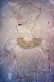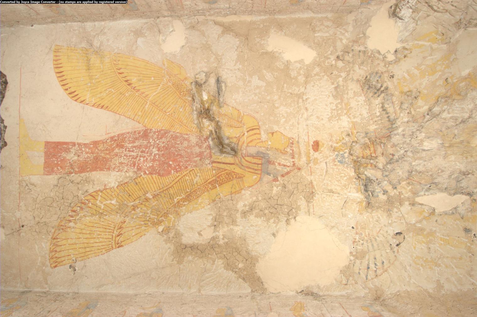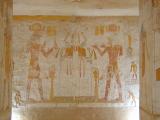 See entire tombThe walls of corridor B are decorated with images of Sety II offering to Ra-Horakhty and Nefertem followed by the opening vignette of the Litany of Ra on the left (southeast) wall, and with Ra-Horakhty and Sokar, as well as the Litany of Ra on the right (northwest) wall. The sunk relief figures of the king and Nefertem found on the left wall of B behind the raised relief images of Sety II and Ra-Horakhty, have been cut over the erased opening vignette of the Litany of Ra. It was originally in raised relief, then recarved in sunk relief. The remainder of the corridor is inscribed with texts of the Litany of Ra. The ceiling displays texts of Osiris and Ra-Horakhty along the edges, with flying vultures (some with cobra heads) in the center, incompletely rendered in paint, alternating with the king's names.