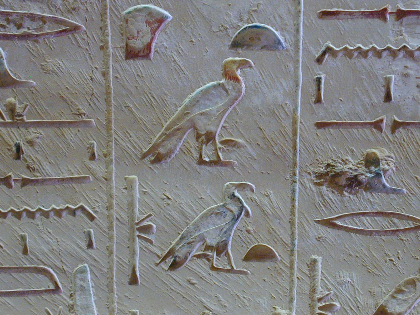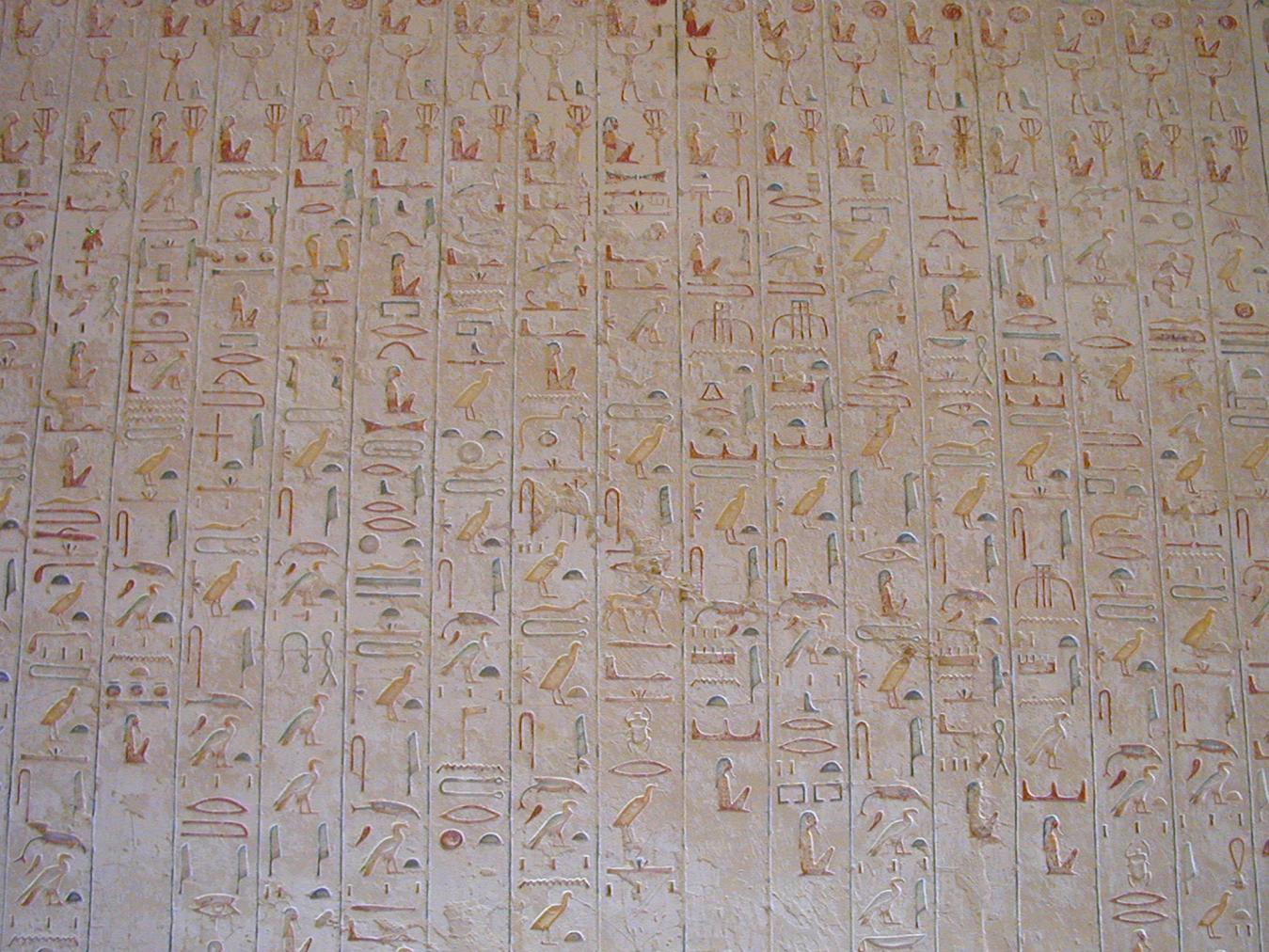 The first corridor is decorated in sunk and raised relief, but the decoration in the remainder of the tomb, probably completed after the death of the king, was done in paint alone. In the second and third corridors, only preliminary sketches were painted on a grayish-brown plaster surface. The scenes on the left walls of corridors C and D are oriented towards the rear of the tomb, while on the right walls they are oriented towards the entrance. Only in pillared chamber F is sunk relief again used, although not always painted, with white background. There is a marked stylistic difference between the decoration in pillared chamber F and the first corridors of the tomb, and even in the first corridor (B) stylistic differences may be seen between the raised and sunk relief.