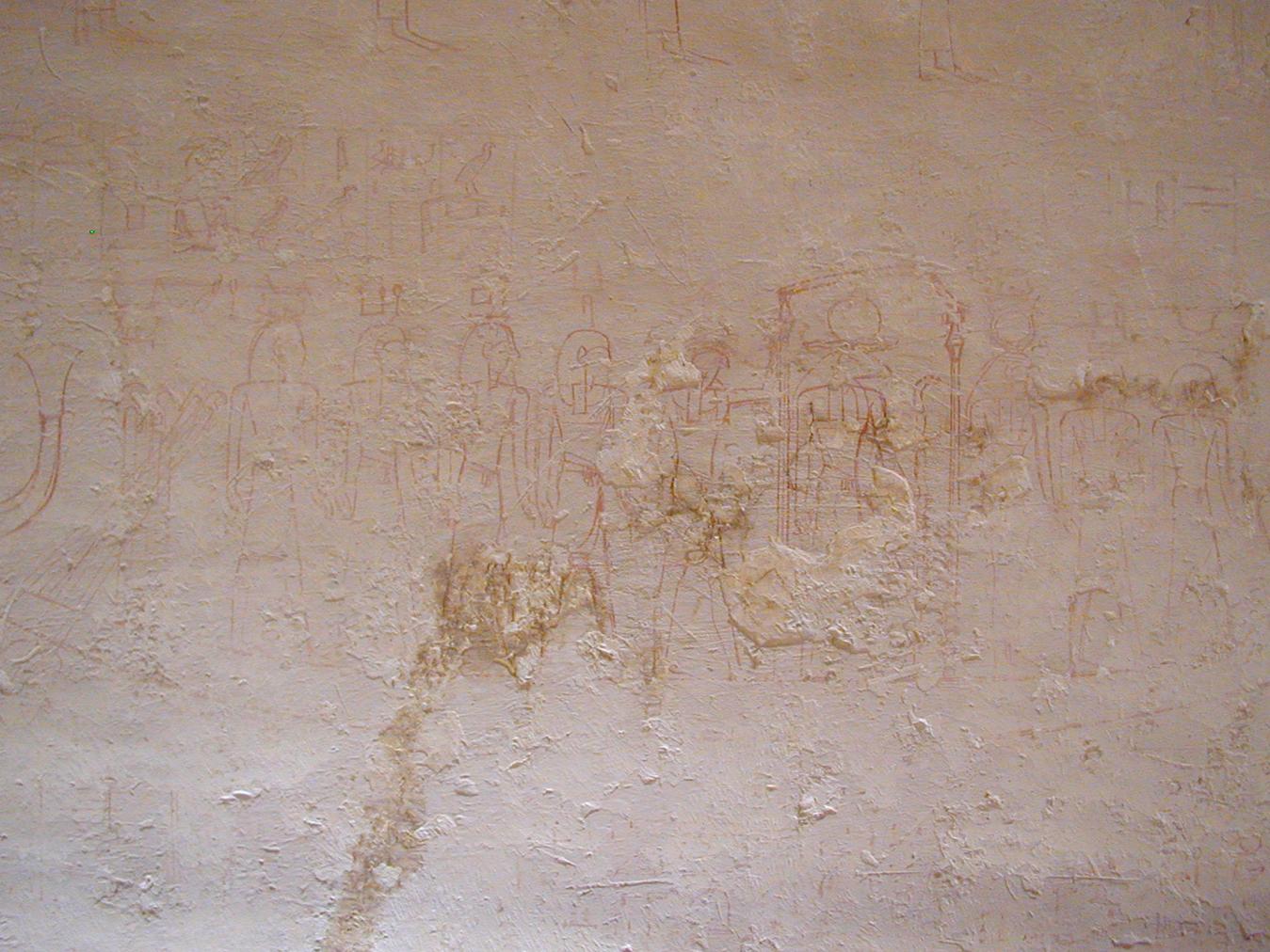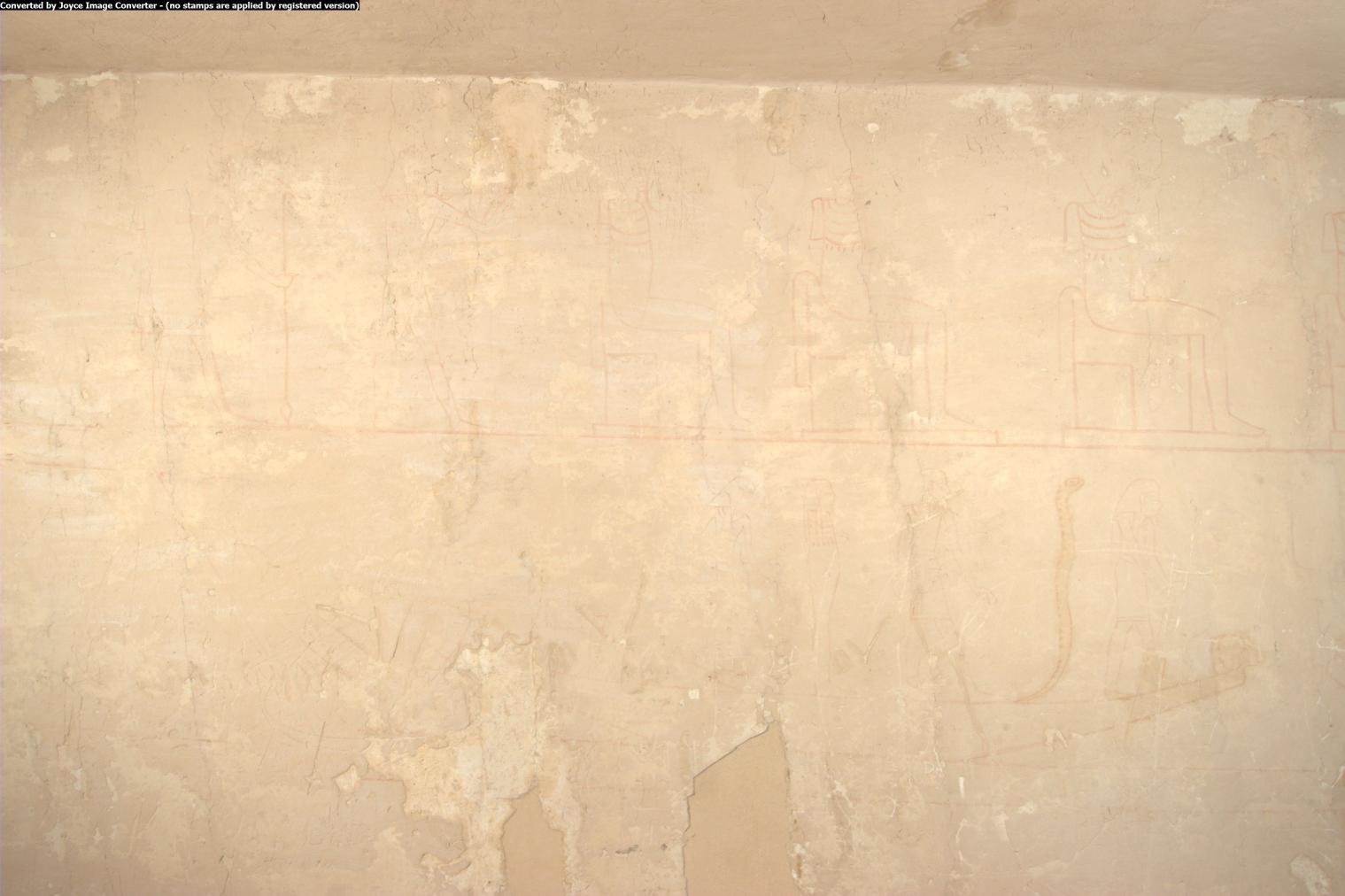 See entire tombThe walls are decorated with preliminary sketches of the fourth and fifth divisions of the Imydwat on the left (southeast) and right (northwest) walls respectively. Two rectangular recesses lie opposite each other near gate E.