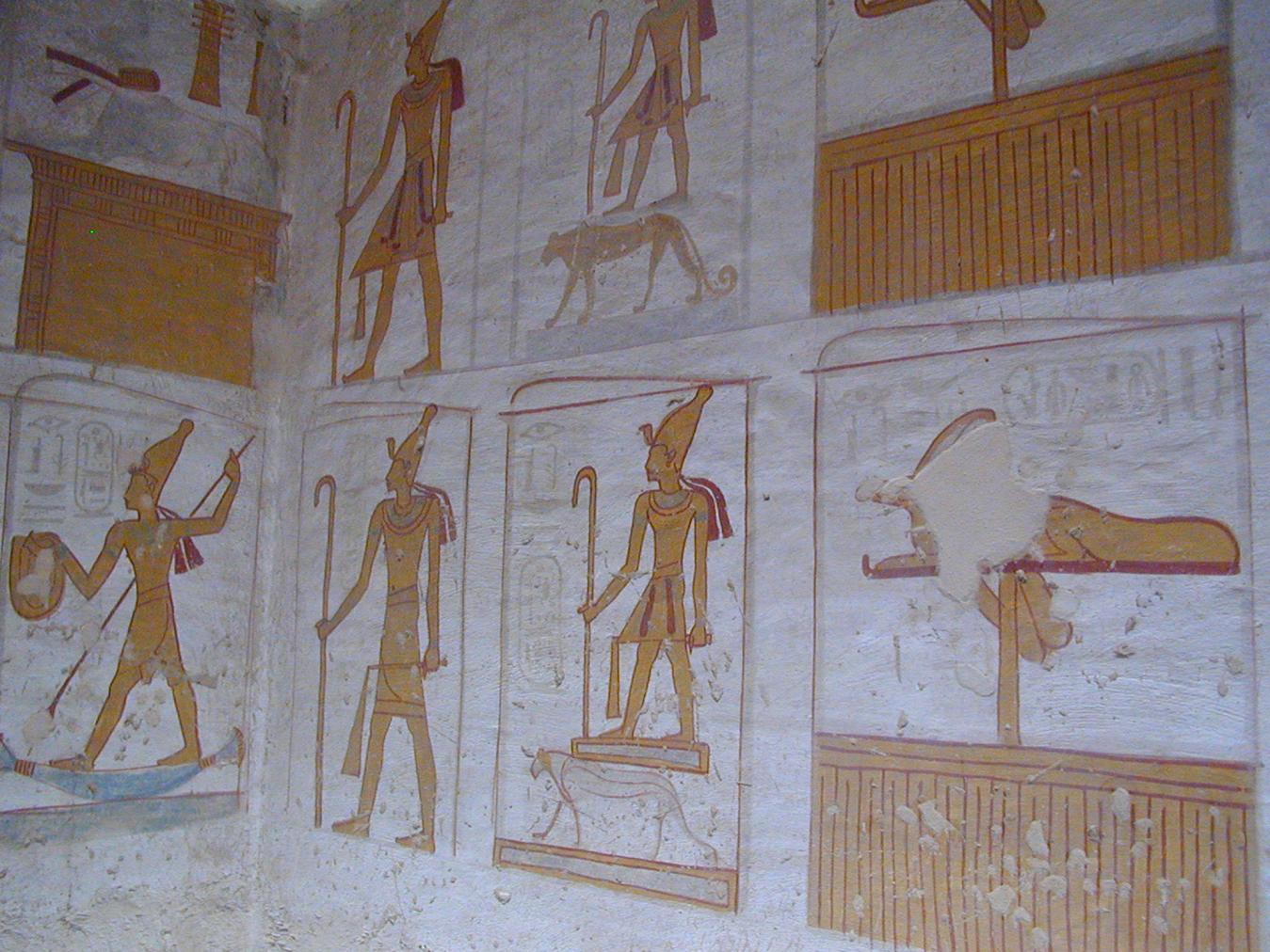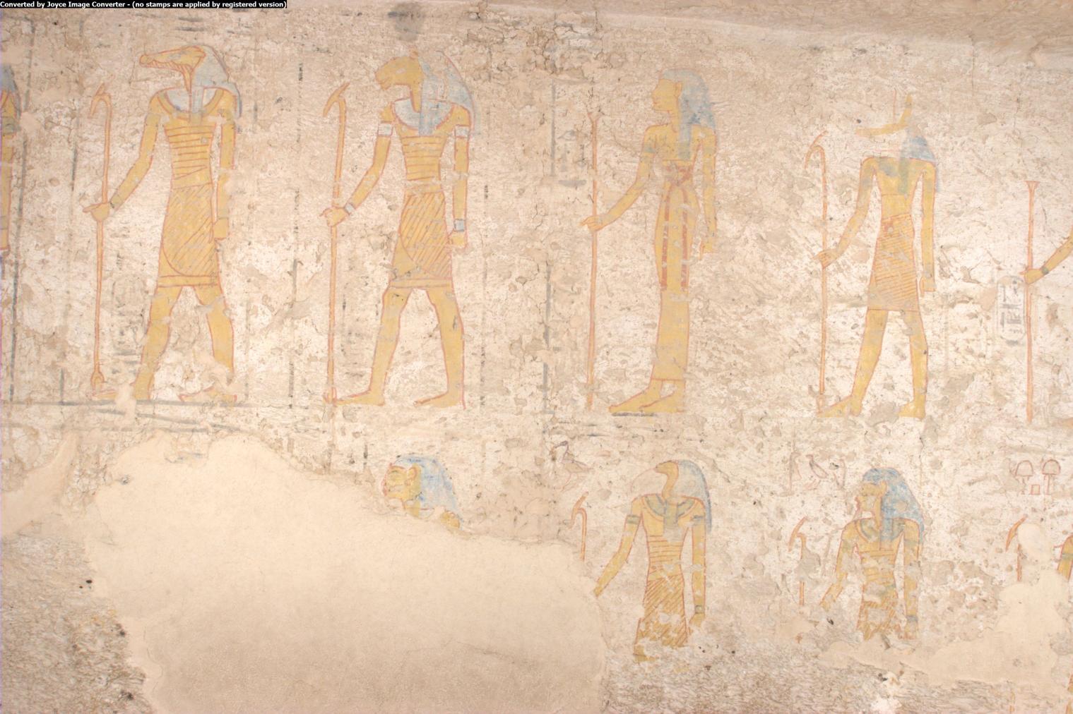 See entire tombThis corridor was hastily converted to a burial chamber at the time of Sety II's death. Its rough walls and ceiling were coated with plaster and decorated with paint. On the walls, Anubis jackals on shrines and two rows of deities representing the followers of Ra and Osiris are placed over a lower register of prone mummiform figures on snake beds taken from the fifth division (p)/sixth hour (H). A figure of Nut with downswept wings stretches along the length of the ceiling and traces of what may be the ba of Ra is painted above her head.
