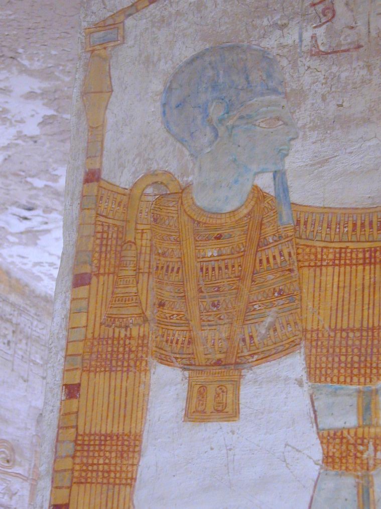 The entrance to the tomb was cut into the cliff with projecting rubble-built side walls. These walls were smoothed over with a layer of white plaster, as elsewhere in the tomb. The usual chamber off the right side of pillared chamber F is lacking here, although a rectangular recess in a comparable position in the left wall may mark the beginning of the door for such a side chamber. Also absent are the high trapezoidal niches at the beginning of corridor C. A rectangular recess, cut at some later date into the beginning of the first corridor's left wall, damaged the raised relief figure of the king. The slope of the entrance and the following corridors is minimal. The walls of the tomb are decorated with scenes from the Litany of Ra (corridor B, gate C, corridor C), the Imydwat (corridor C, corridor D), the Book of Gates (pillared chamber F, burial chamber J), and representations of the deceased and deities (corridor B, corridor C, gate D, chamber E, pillared chamber F, burial chamber J).