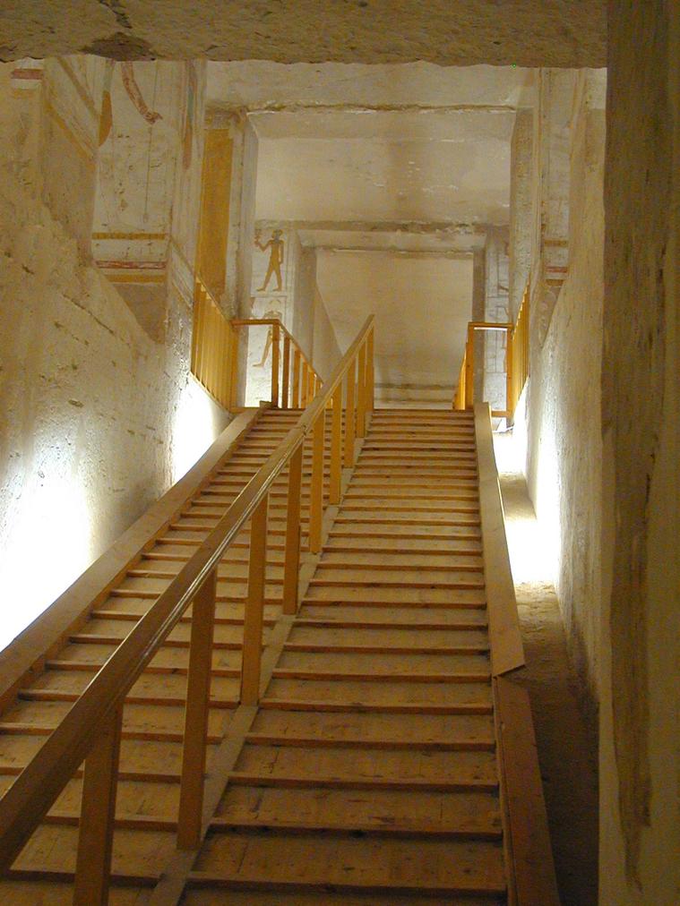 The entrance to KV 15, the tomb of Sety II, like that of his wife Tausert (KV 14), is cut directly into the vertical cliff face at the head of the branch Wadi running southwest from the main valley. The tomb lies on a northeast-southwest axis, and consists of a short entryway (A), three long corridors (B, C, D), a chamber without a Well shaft (E), a pillared chamber with a central descent (F), and a burial chamber (J) adapted from an unfinished corridor.