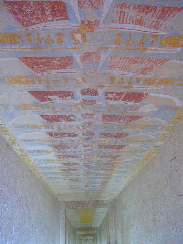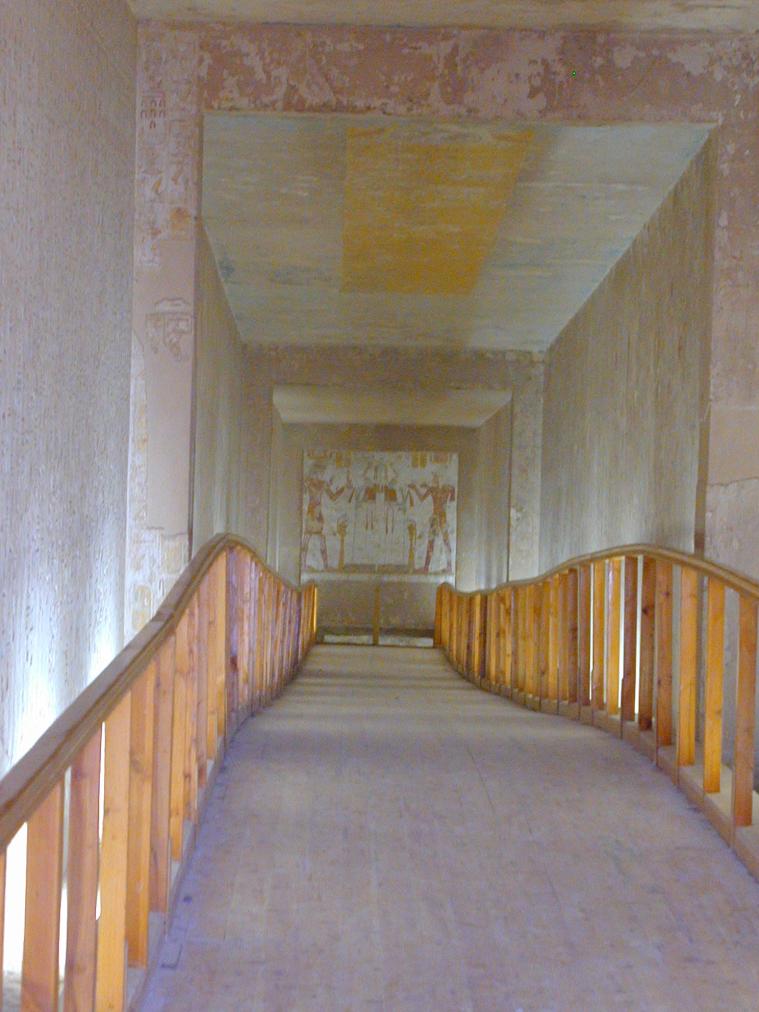 See entire tombThis corridor has a shallow slope and lacks the usual wall recesses at its beginning. The decoration of the walls was done only as preliminary sketches in red paint. Sety II offers an image of Ma'at to Ra-Horakhty on the left (southeast) wall and incense to Sokar on the right (northwest) wall. The remainder of the walls show portions of the Litany of Ra, including the seventy-five forms of the sun god, as well as the second and third hours of the Imydwat on the left and right walls. The central portion of the ceiling is decorated with a sun disk containing the ram-headed bird representing the ba of Ra. It is flanked by Isis and Nephthys as kites, followed by more texts of the Litany of Ra. The unfinished remainder was to have been covered with stars.