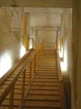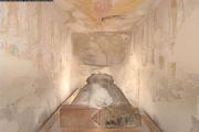 See entire tombThis pillared chamber contains two pairs of pillars flanking a central descent. A recess in the center of the left (southeast) wall, may be an unfinished cutting for a gate to the usual side chamber which is absent here. The west corner of the chamber has not been cut to floor level. The mummy currently displayed in a modern case to the right of the entrance is intrusive.