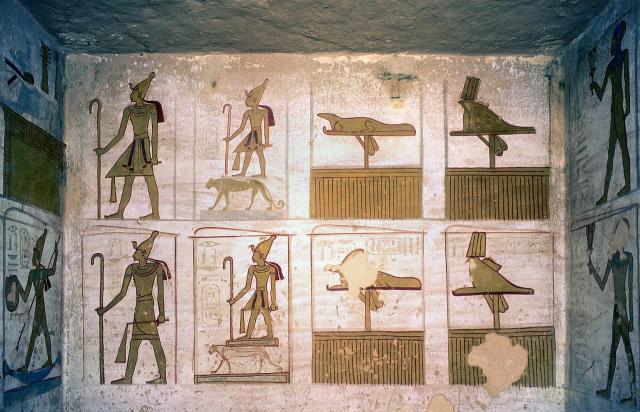 See entire tombThe well shaft was not cut. The usual protective deities associated with this chamber (four sons of Horus and four goddesses) have been replaced by images of various divine statues, similar to many of the actual wooden statues found in the tomb of Tutankhamen.