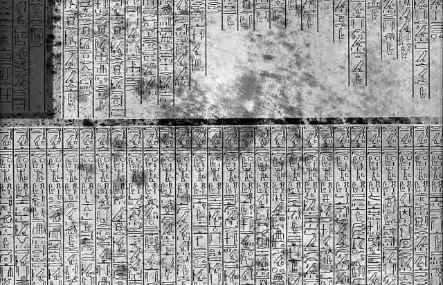 See entire tombThe compound jamb of gate C is fitted with a set of door pivot holes, showing that it was once closed by a pair of wooden doors. The outer lintel bears a sketch of a winged disk and the reveals and outer thicknesses show the Litany of Ra.