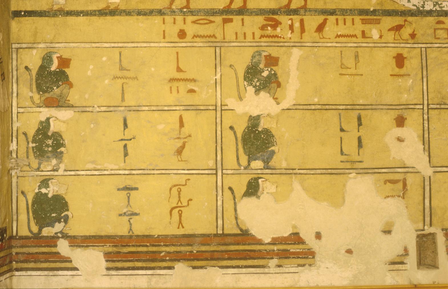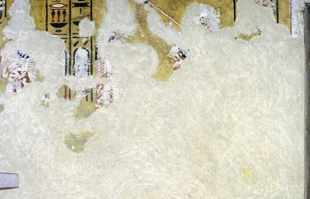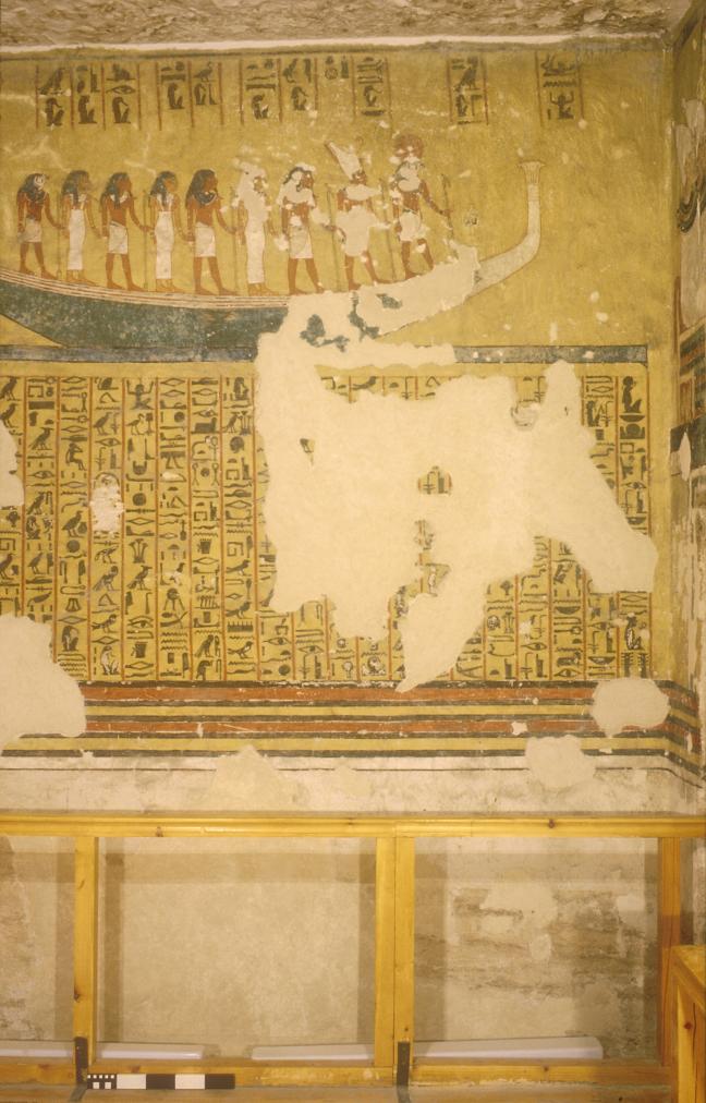 Throughout burial chamber J, parts of the decoration have been lost. In some instances, this is the result of deliberate damage to the figures and names of the king, but there are also areas (e.g., to the right of the entrance) where stone has simply fallen away.