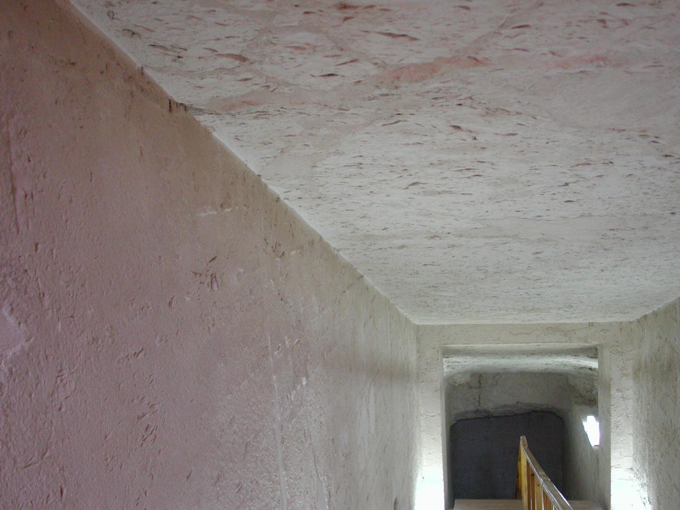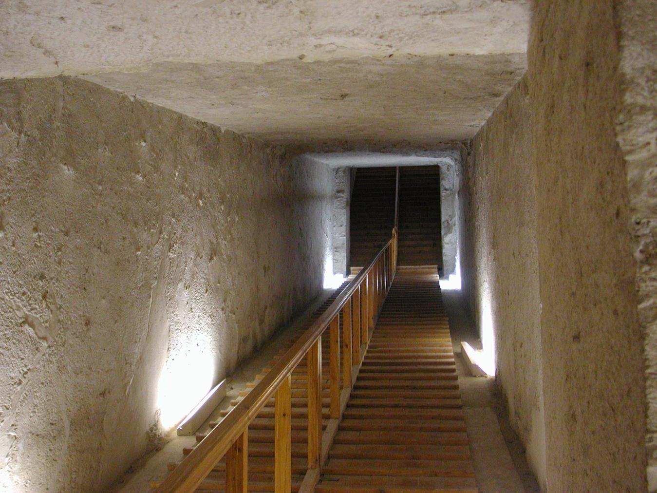 See entire tombBeyond the second gate, a stairwell, flanked at the top by trapezoidal recesses, passes beneath a projecting overhang at its lower end. The steps are badly damaged.