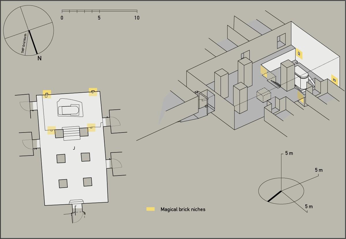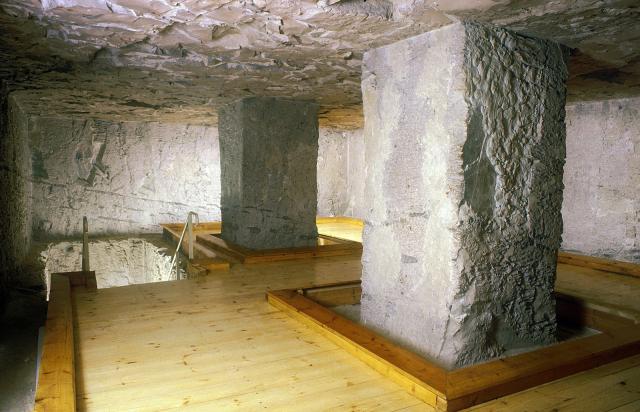 See entire tombThe burial chamber is divided into two levels: an upper section with a double row of three pillars on a north-south axis; and a lower section, covering one-third of the chamber. In the center of the lower section, sometimes called the "crypt," sits the yellow quartzite sarcophagus of Amenhetep II. There are four side chambers, two to the right (west) and two to the left (east). There are two pairs of magical brick niches on the front (north) and rear (south) walls of the crypt, and two recesses beneath those in the rear wall. The sarcophagus rests on two large calcite blocks set into a pit in the floor of the crypt.