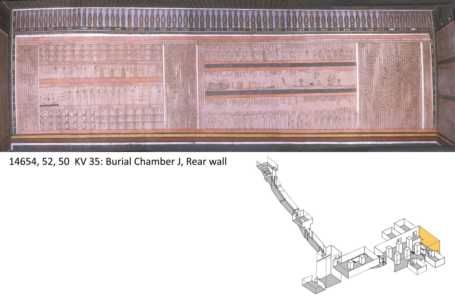 KV 35 possesses several architectural innovations: a side chamber at the bottom of the Well shaft and a corridor (G) between descent F and the burial chamber J, which was rectangular with a floor on two levels. The form of the burial chamber established in this tomb continued in use until Dynasty 19. The tomb was also later used as a cache for royal mummies.