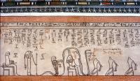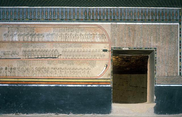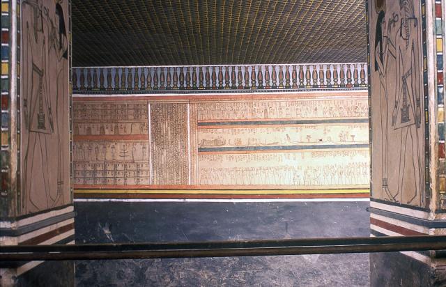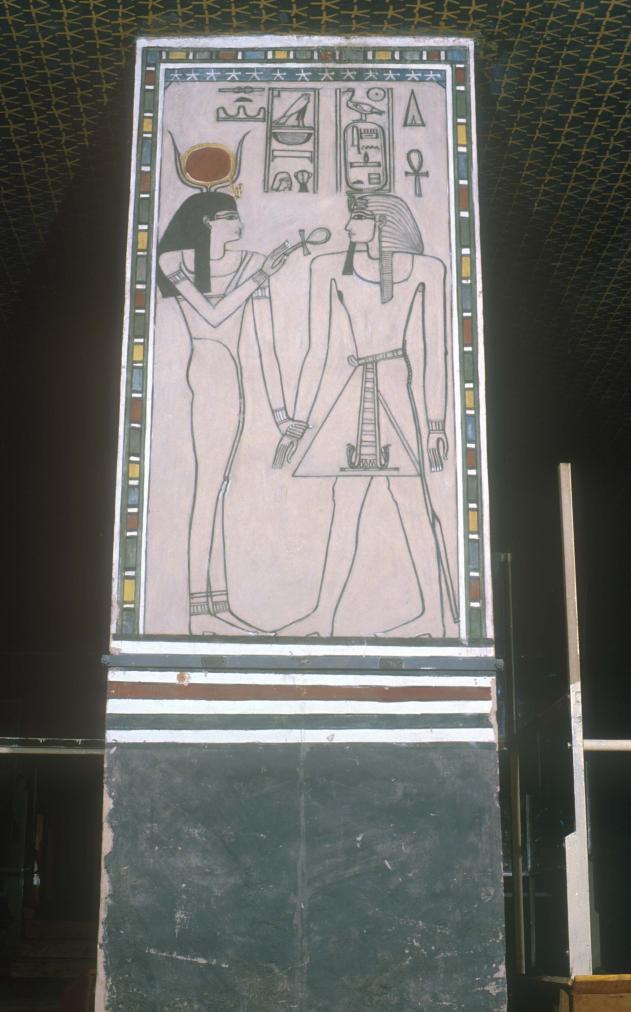 The burial chamber is decorated with scenes of the Imydwat executed in a style similar to that in the tomb of Thutmes III (KV 34), and the pillars with representations of the king with Osiris, Hathor and Anubis.